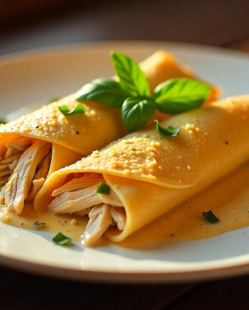 Arma los crepes rellenos de pollo: Coloca una porción del relleno en el centro de cada crepe, enrolla o dobla y acomoda en una refractaria.